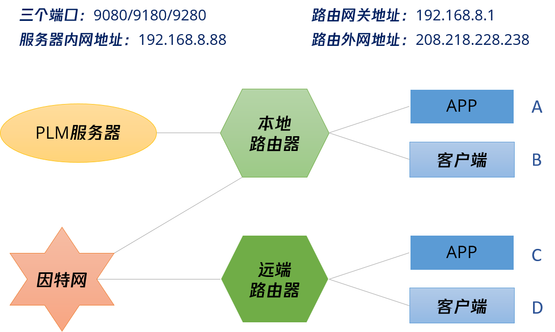 沒有在本地路由器做任何映射之前,A和B可以通過192.168.8.88和對(duì)應(yīng)的三個(gè)端口9080/9180/9280 訪問PLM服務(wù)器。但是C和D就不能了。因?yàn)镃和D沒有直接連接在本地路由下,是不能直接通過192.168.8.88這個(gè)地址進(jìn)行連接的。如果要C和D也能夠訪問PLM服務(wù)器,就必須要在本地路由器中進(jìn)行端口設(shè)置了。