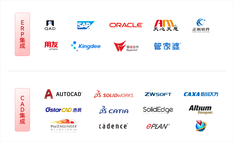 與CAD/CAPP/ERP/MES/CRM/SRM/OA等系統(tǒng)無(wú)縫集成,將各系統(tǒng)中的共同信息提取出來(lái),實(shí)現(xiàn)各個(gè)系統(tǒng)在數(shù)據(jù)級(jí)上的集成,保證數(shù)據(jù)一次性輸入,多次重用。